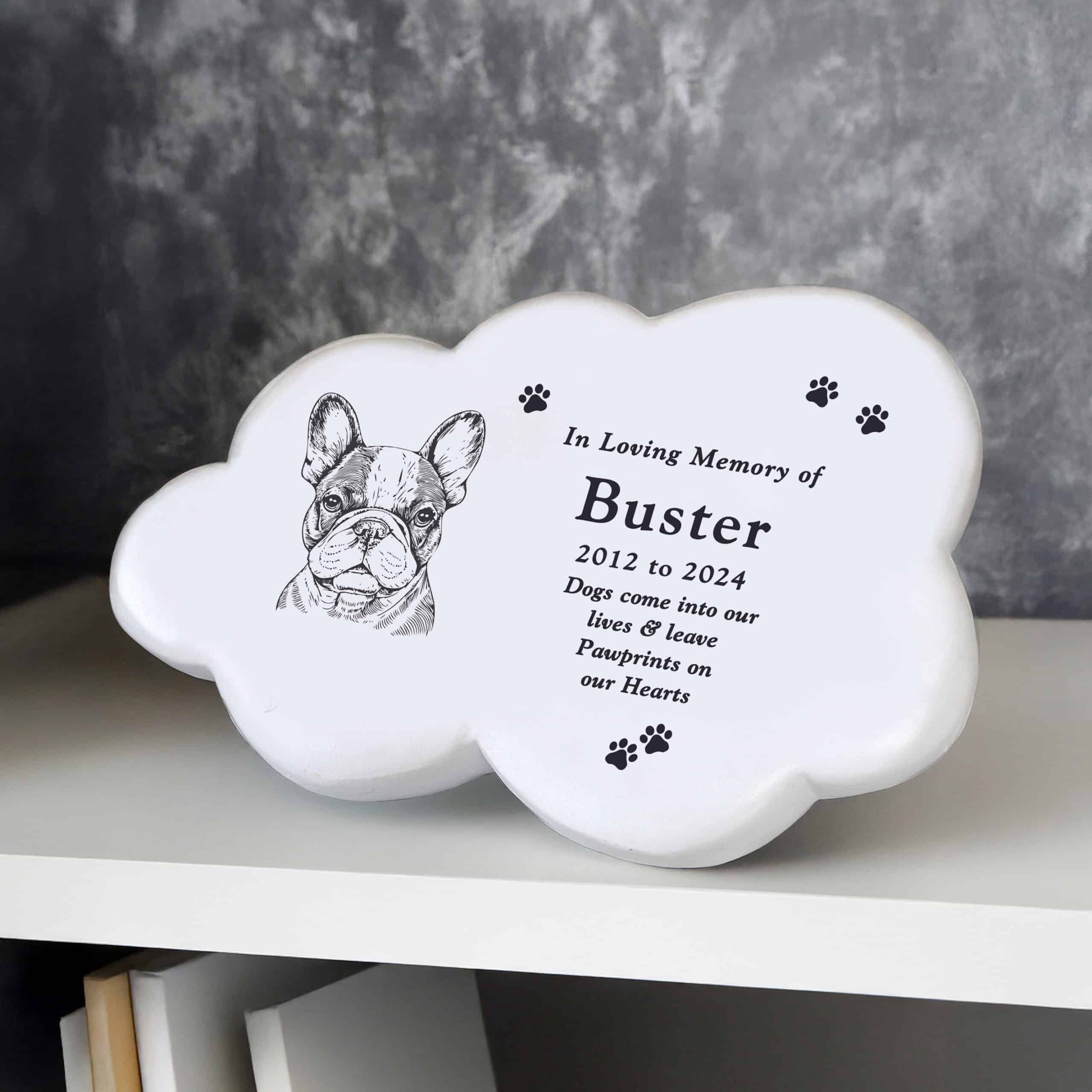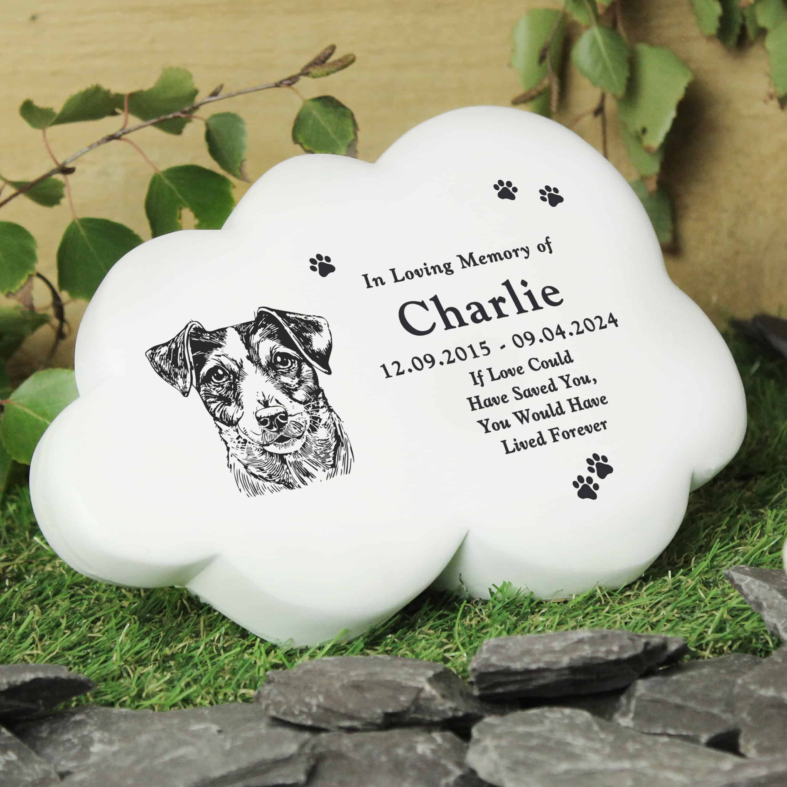 A cloud-shaped garden marker featuring your dog’s breed illustration and a personal message. Weatherproof and designed to sit beautifully outdoors as a lasting tribute.