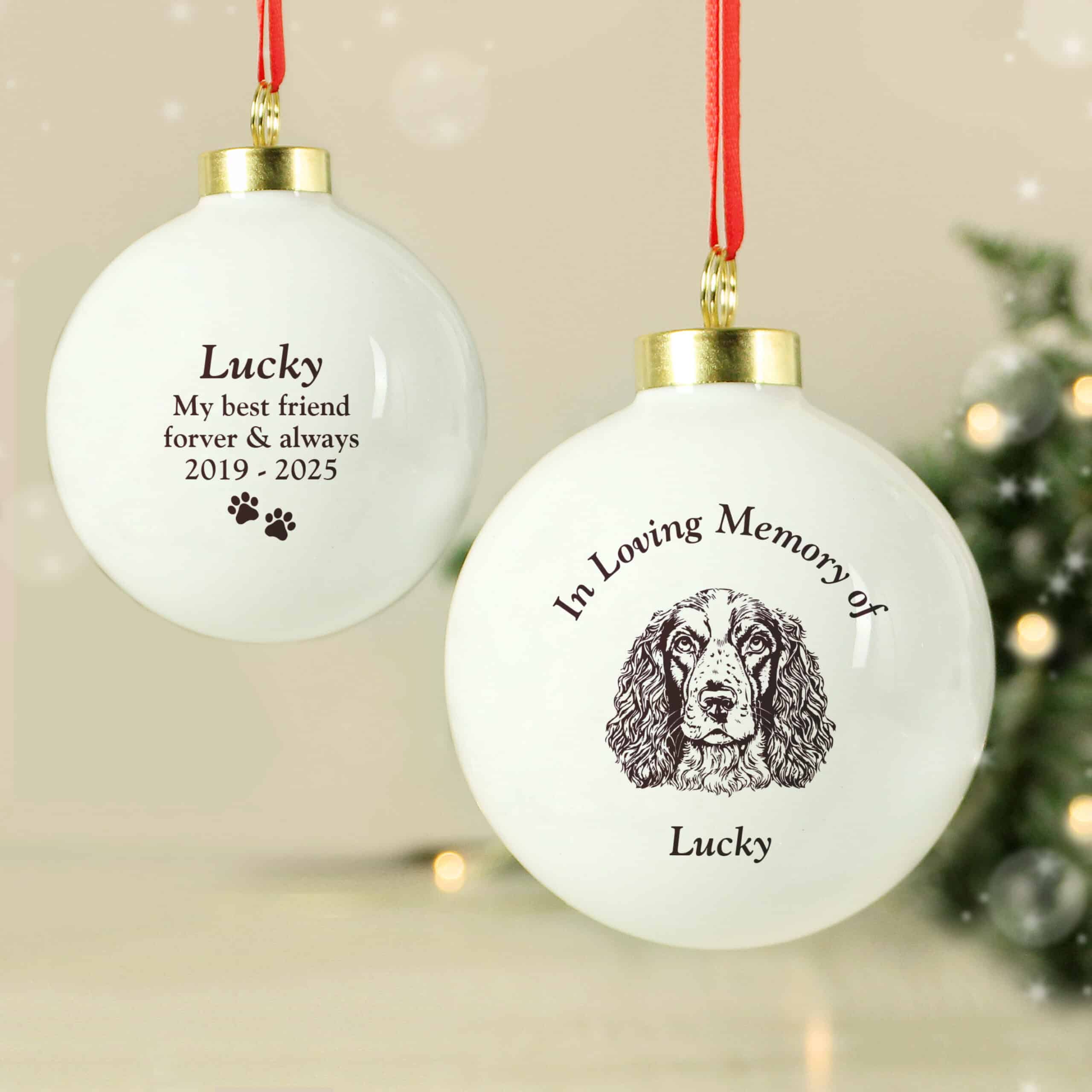 Christmas can feel a bit different without them padding around the wrapping paper. This bauble keeps them part of the celebration — hang it on the tree and know they've still got their spot. Choose their breed and pop their name on it for something truly personal.