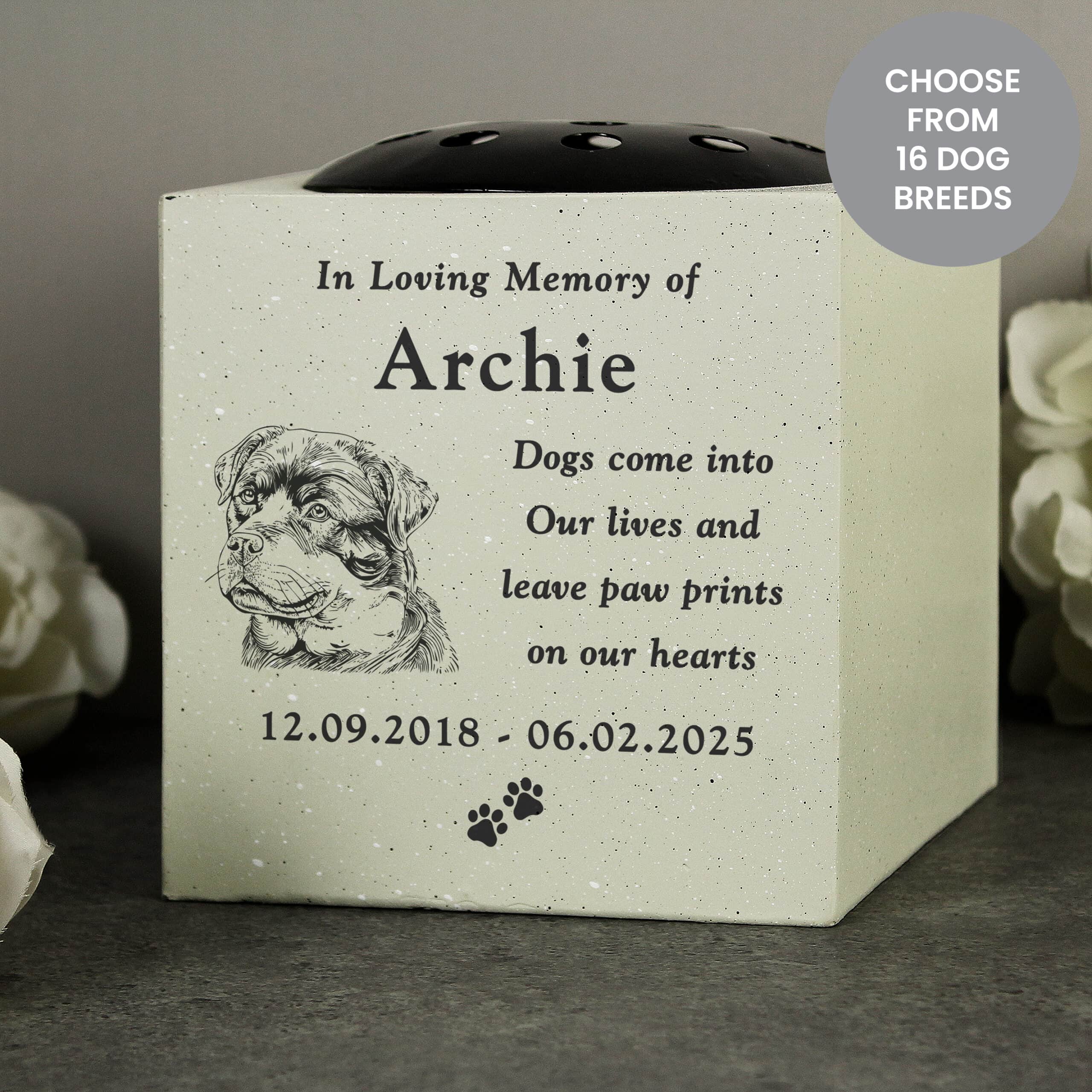 Fresh flowers in the garden, right where they used to roll around in the grass. This vase is built to last outdoors and features your dog's breed alongside a personal message. A lovely way to keep their memory close and tend to it with every bunch of flowers you place.