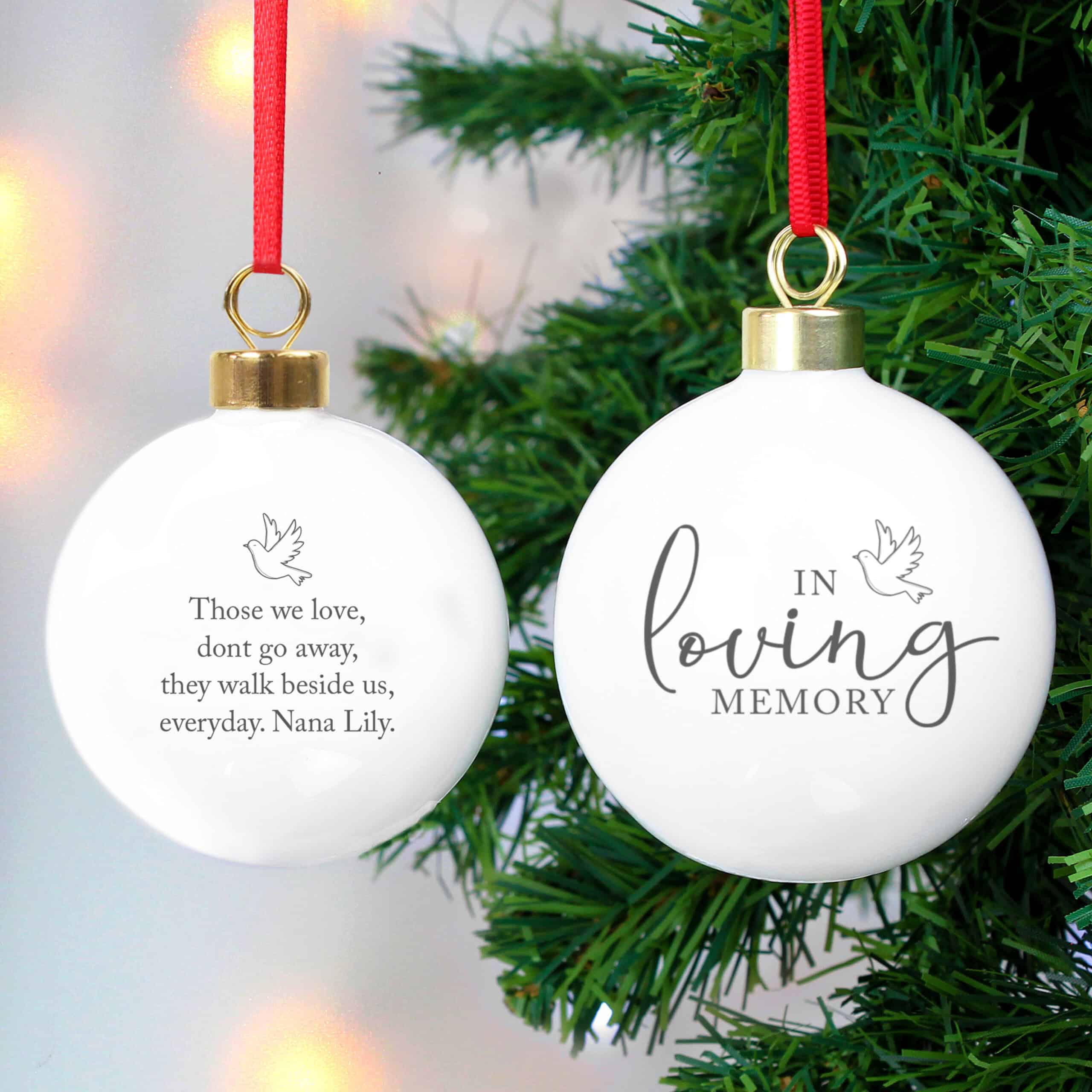 A classic ‘In Loving Memory’ ceramic bauble with room for a personal message on the reverse. Simple, elegant, and a lovely way to remember your boy or girl at Christmas.
