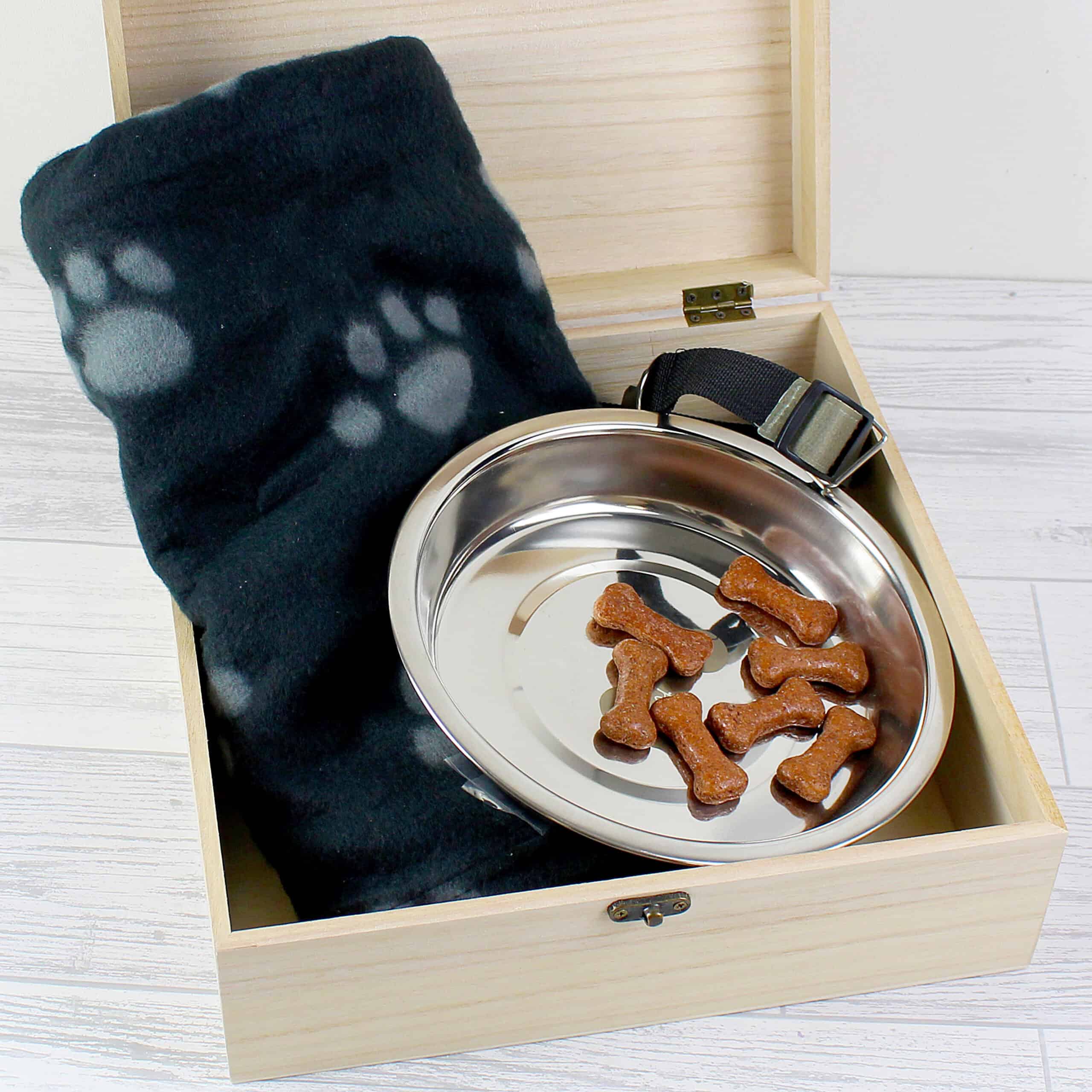 A large wooden keepsake box with your dog’s breed illustrated on the lid — a lovely home for their collar, tags, and all the little things that remind you of them.