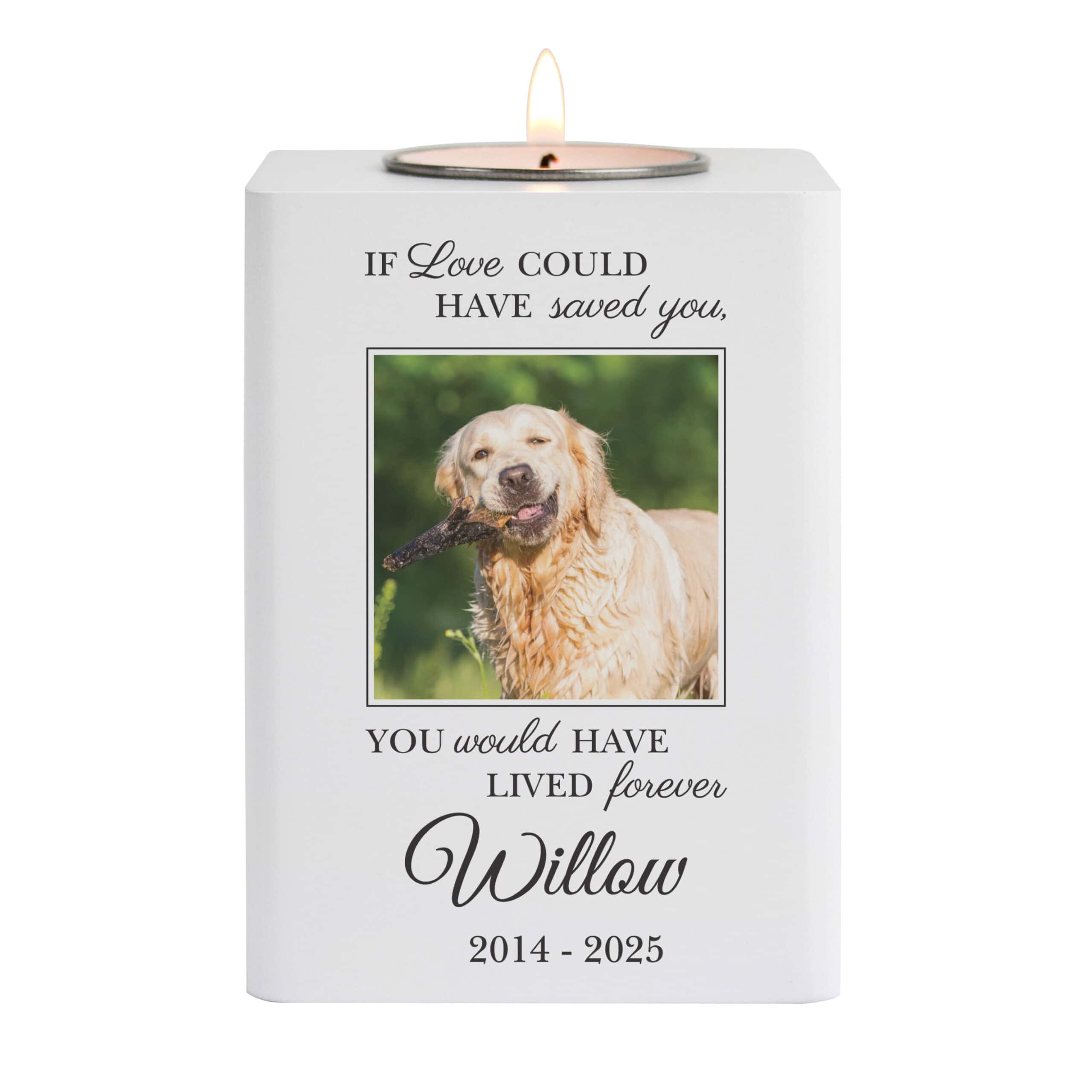 A personalised tealight holder featuring your dog’s photo and the words ‘If love could have saved you, you would have lived forever.’ A gentle glow to remember them by.